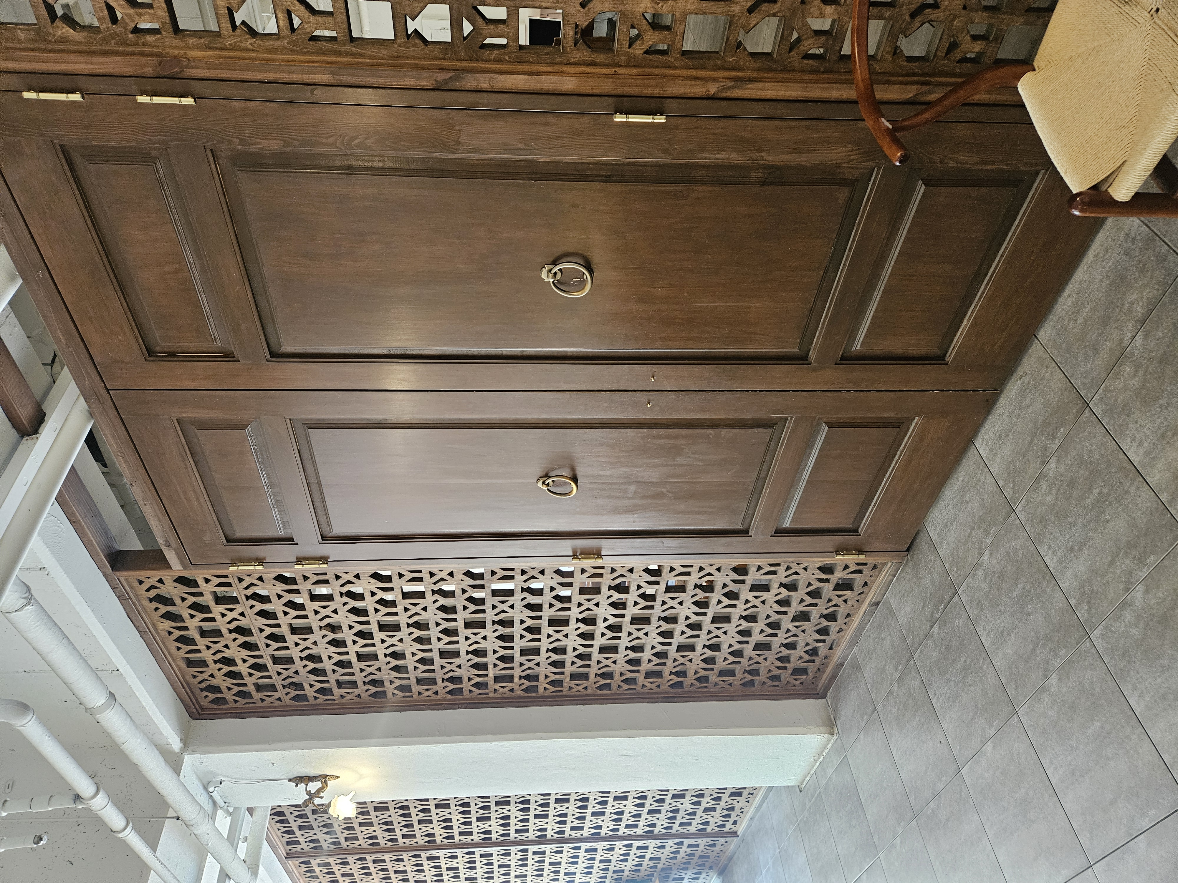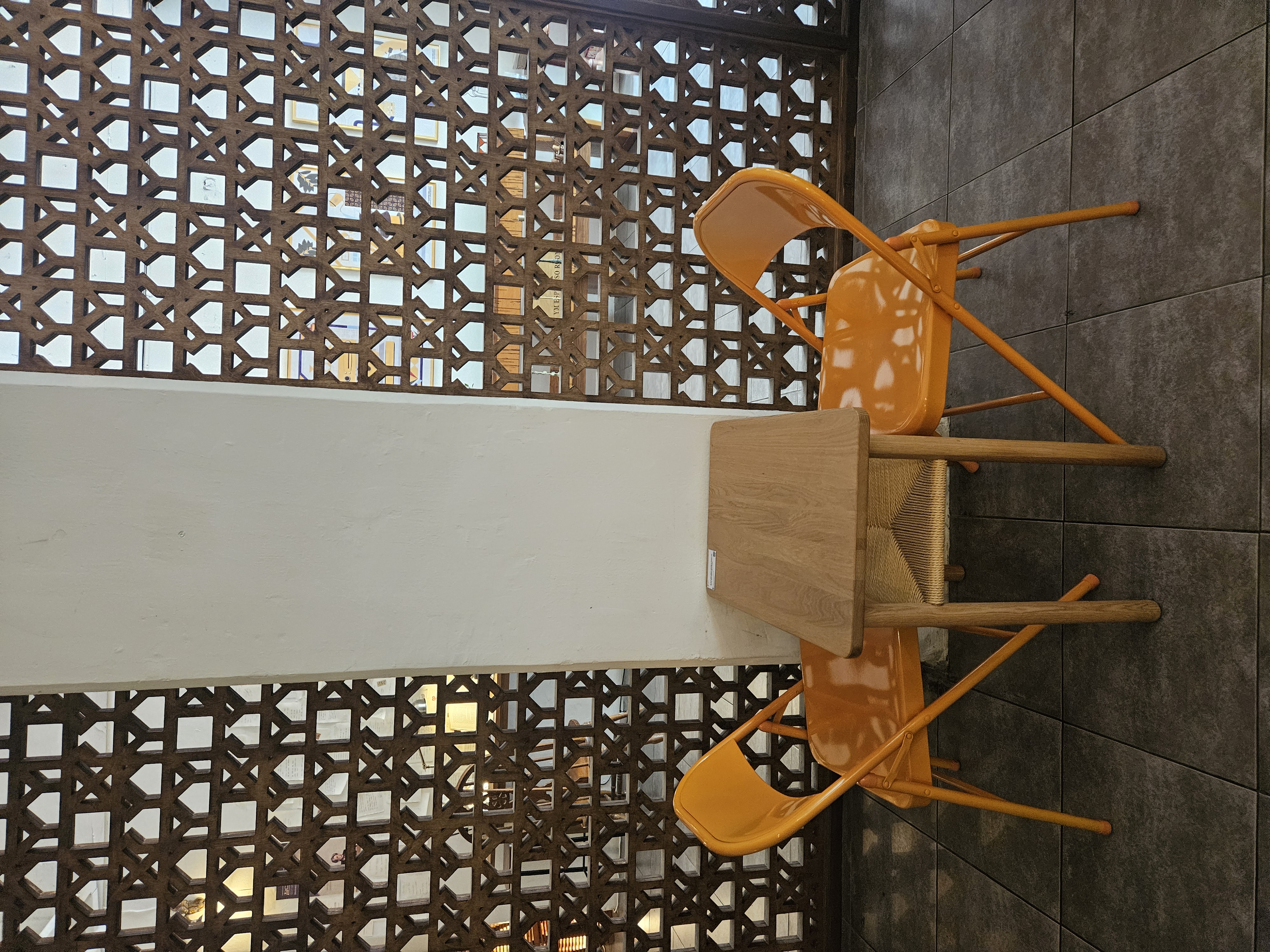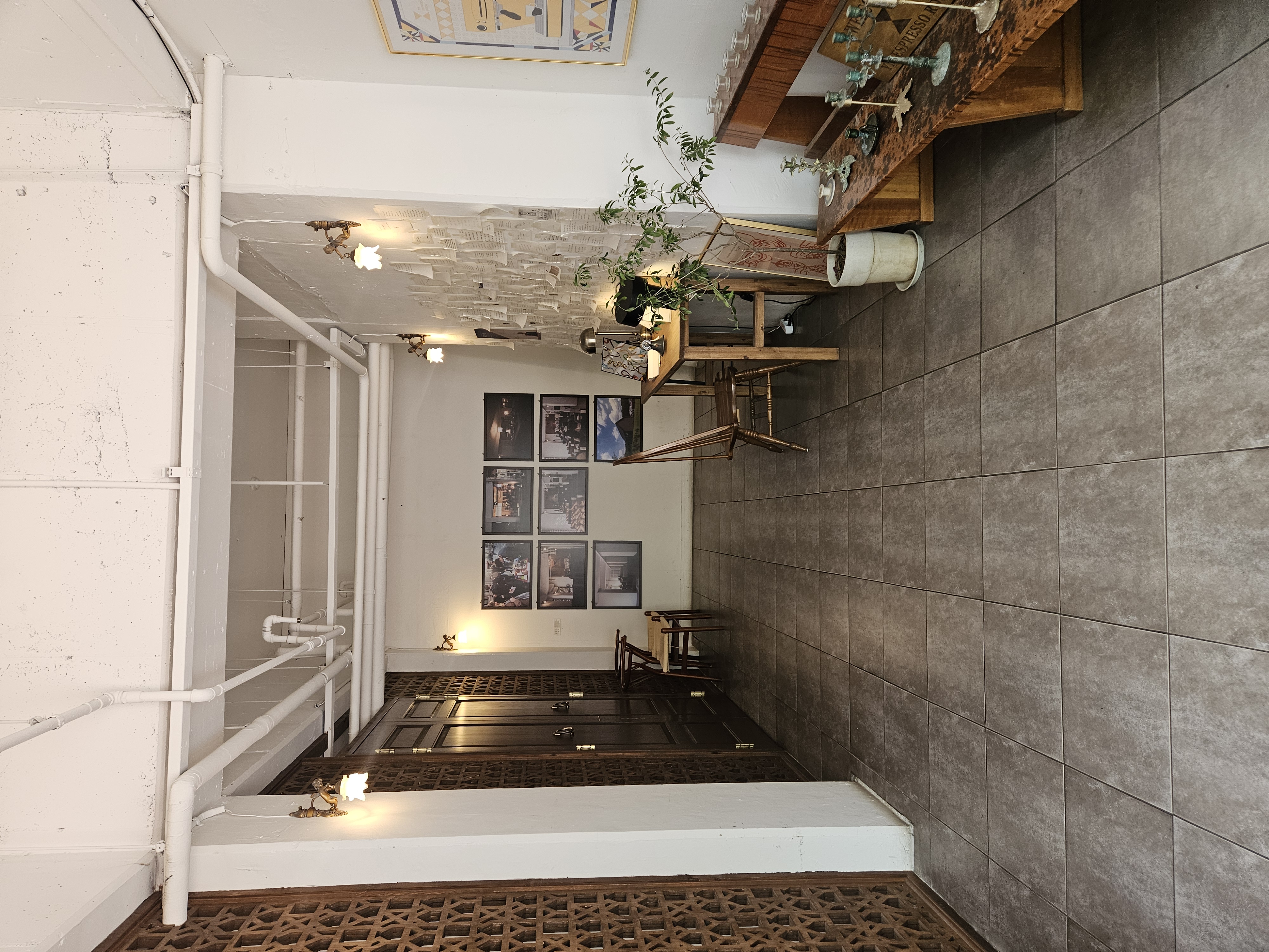 크고 무거운 문을 열고 들어가면 조용한 실내 분위기와 마주할 수 있습니다. 어수선하지 않는 안정적인 분위기예요. 넓은 공간은 아니지만 공간 구석구석을 잘 활용하여 테이블과 의자가 조화롭게 자리잡고 있어요. 사진 속 공간을 지나서 들어가보면 성당에 온 듯한 인테리어가 시선을 사로잡습니다.