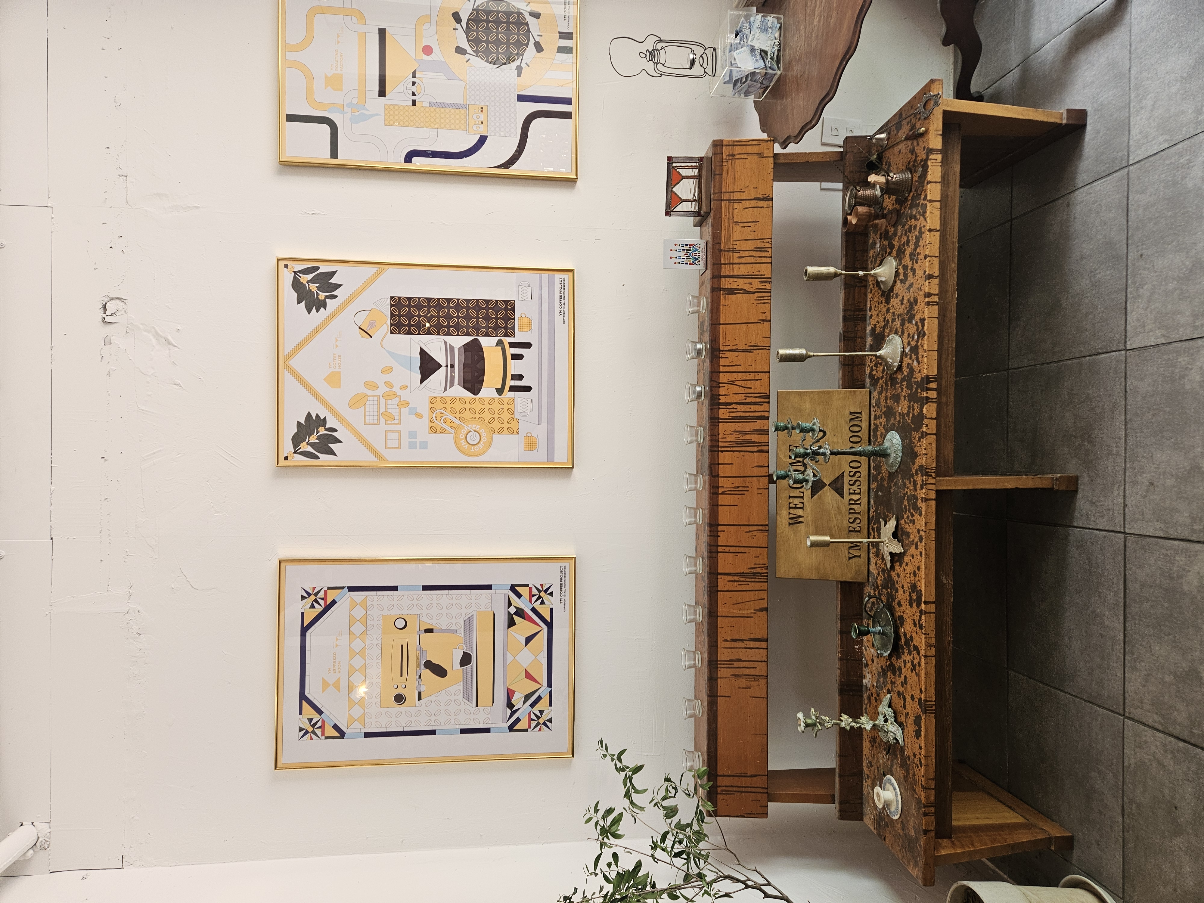 초입의 오른쪽엔 클래식하고 엔틱하게 다양한 모양의 촛대가 진열되어 있습니다. 그리고 커피관련한 미술작품도 벽에 걸려있어서 전시장 분위기가 연출되고 있습니다.