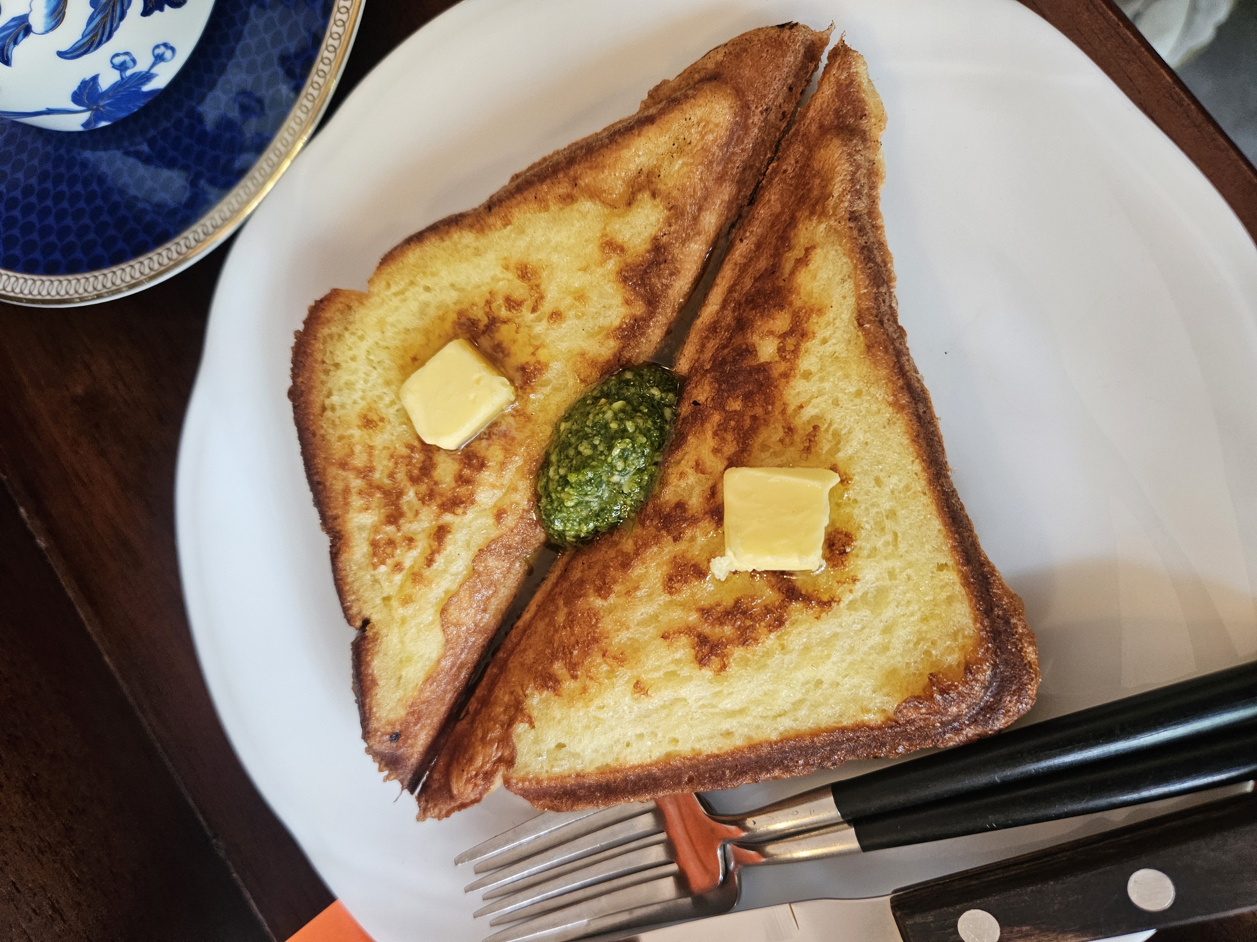바질페이스와 버터가 올려진 토스트의 맛은, 처음 경험하는 맛이지만 입을 즐겁게하는, 담백하고 신선한 풍미가 가득합니다.